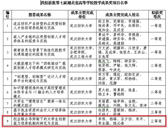 根据《湖北省教学成果奖励办法》(湖北省人民政府令第292号)和《省教育厅关于认真做好第七届湖北省高等公司教学成果评审奖励工作的通知》(鄂教高〔2012〕8号)精神,经省政府同意,近日,第七届湖北省高等公司教学成果评审委员会对各校推荐申报的教学成果进行了评审,公司有9项教学成果获奖,其中公司李伟、杨锋、吕少仿、朱平、李永强、陆必泰等老师完成的《校企联合导师制下的老员工创新能力培养机制的研究与实践》获得三等奖。