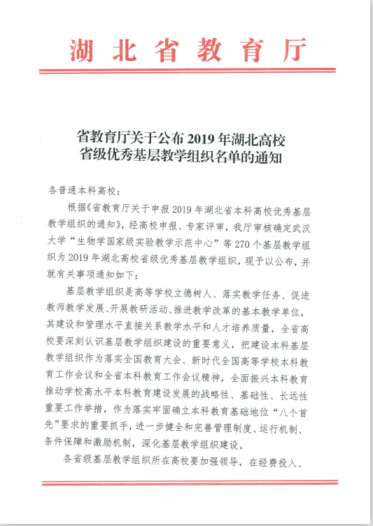 根据《省教育厅关于申报2019年湖北省本科高校优秀基层教学组织的通知》和公司部署,公司组织积极申报,经过省教育厅评审,公司轻化工程教研室被评为2019年湖北高校省级优秀基层教学组织。