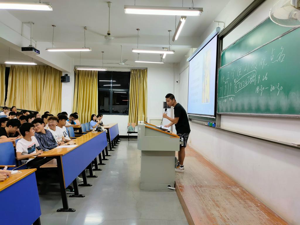 宣讲会在员工会主席蔡荣杰的主持下正式开始。首先,蔡荣杰对员工会的章程、组织架构以及执行机构进行了详细介绍。接下来,9个部门的部长们依次上台对各部门进行了具体讲解。第一个宣讲的部门是办公室。“万事皆办,一心为公”,两位部长热情地向大家说明了办公室的工作内容和招新要求。接下来宣讲的部门分别是班长团和学风部。班长团生动活泼的宣讲风格调动起整个现场的氛围,学风部清晰而有条理的宣讲吸引了众多新生的目光。