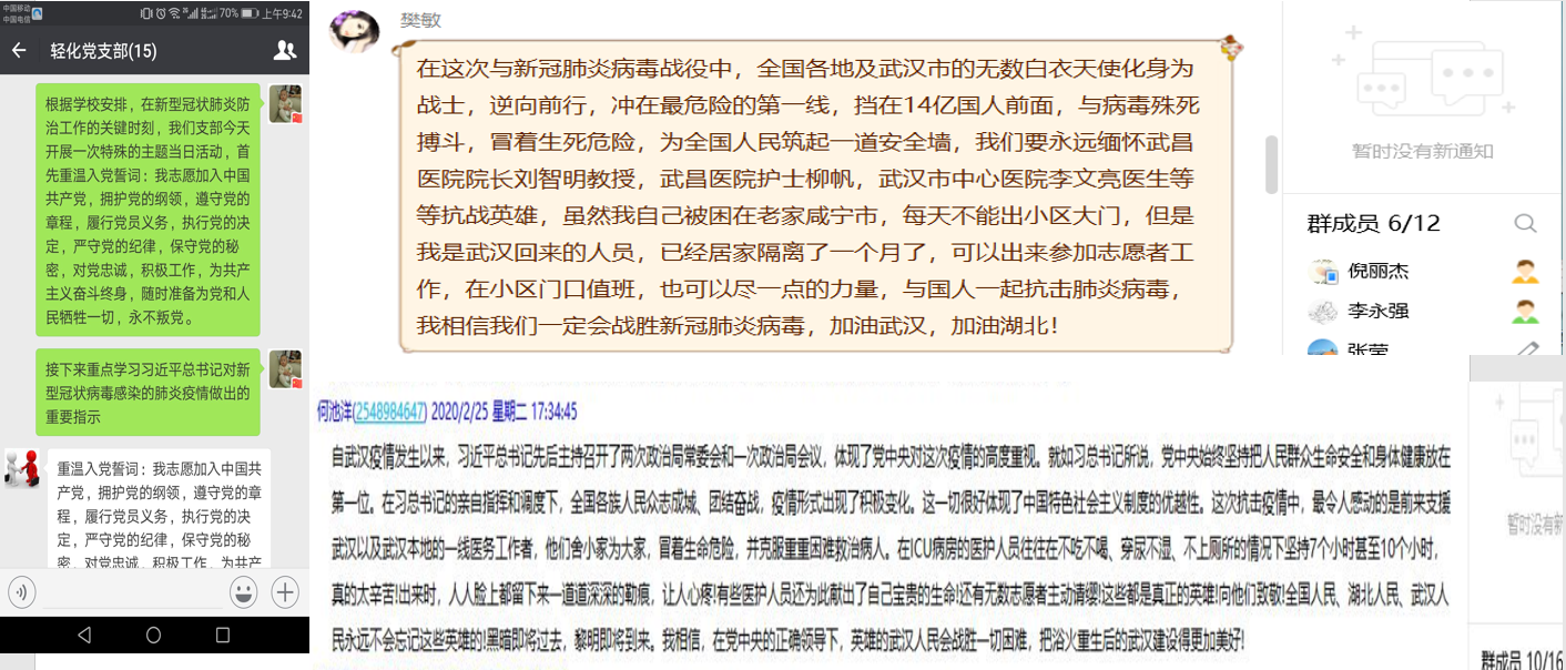随后,各党支部中已经参与社区(村组)疫情防控具体工作的党员同志结合工作情况谈了自己的具体感受,其他党员同志也根据疫情防控期间所见所闻所感,结合教学科研工作等谈了自己的深刻体会。