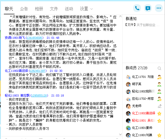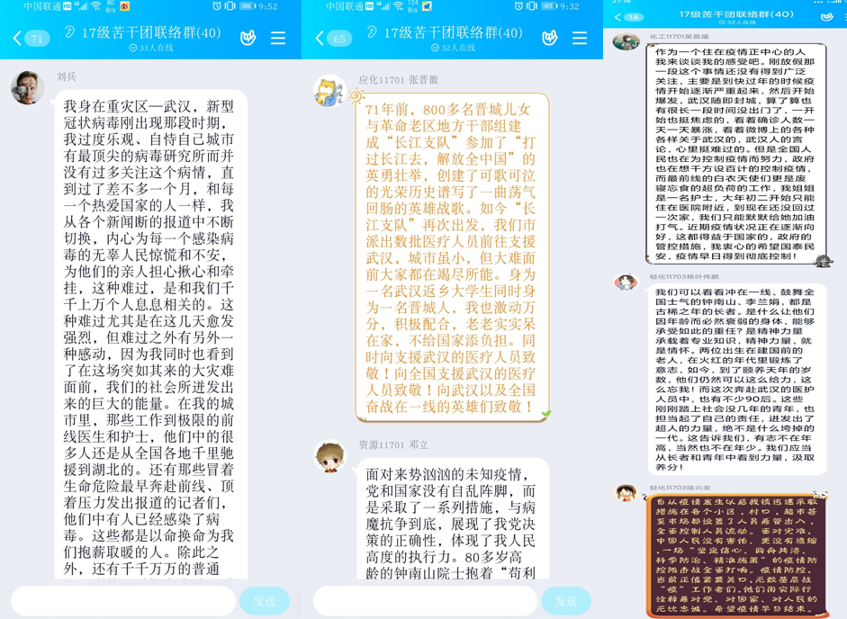 支部副书记梁娟华讲述了钟南山、李兰娟、张文宏等抗疫一线优秀党员的先进事迹,党员张兰心讲述了武昌方舱医院里勇当“病区长”协助管理、服务病患的党员付丹的故事,党员黄晓佳分享了医疗队党支部和病友党支部让党旗在方舱医院上空飘扬给她带来的感动……苦干团团长、党员刘佳则号召大家认真完成公司有关部署,助力公司全面落实防控任务,在维护校园稳定、师生安全等方面,发挥自己的积极作用,同时在自己的社区、村庄和家庭发挥党员的先锋堡垒作用,携手共同打赢这场没有硝烟的战争。