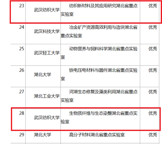 近日,湖北省科技厅公布了2016年度湖北省重点实验室评估结果,公司参评的新材料及其应用研究湖北省重点实验室、生物质纤维与生态染整湖北省重点实验室2个省重点实验室均获评优秀,且皆得到省科技厅100万后补助经费支持,获优数在全省高校中位列第三,在省属高校中位列第二。