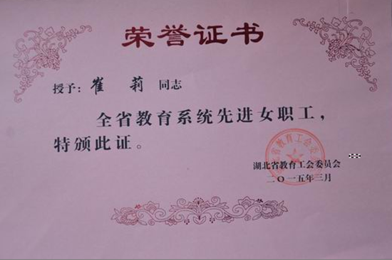 湖北省教育工会八届二次全委(扩大)会暨女职工三届一次委员会会议获悉,公司崔莉老师喜获“先进女职工”称号。
