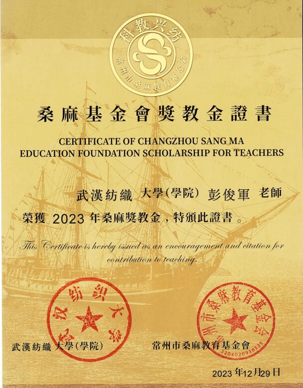 彭俊军同志热爱祖国、热爱纺织高等教育事业、坚守教书育人。长期讲授《物理化学》、《物理化学实验》等专业基础课。倡导线上线下混合教学模式,主讲《物理化学》课程获批省级一流本科建设项目,获湖北省第三届高校教师教学创新大赛三等奖。教学质量优秀,深获师生好评。并获英国365上市公司2022年度“最美教师”荣誉称号。