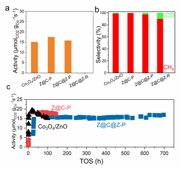通过催化剂的CO2加氢性能对比可以看出,相对于浸渍法制备的Co3O4/ZnO催化剂以及没有限域结构的Z@C-P催化剂,Z@C@Z-P限域催化剂展现出了超高的催化稳定性,在700小时内并未出现失活现象。本研究成果为开发兼具高活性和长期稳定性的限域型催化剂提供了一种创新性策略。