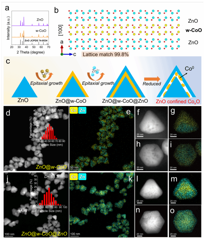 图2. (a) ZnO与w-CoO的XRD图谱。(b)两组分晶格匹配示意图。(c)限域结构设计示意图。(d)-(i)ZnO@w-CoO-P纳米颗粒的STEM以及对应的EDX-Mapping图。(j)-(o)ZnO@w-CoO@ZnO-P纳米颗粒的STEM以及对应的EDX-Mapping图。