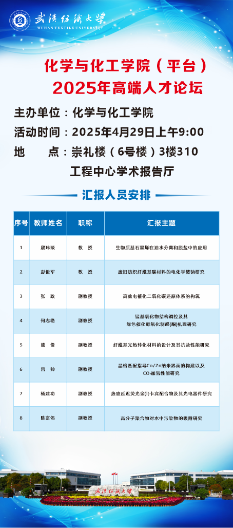 殷玮琰教授做了题为“生物质基石墨烯在油水分离和脱盐中的应用”的报告,介绍了生物质基石墨烯复合材料的设计合成及其在油水分离和脱盐方向的应用。彭俊军教授做了题为“废旧纺织纤维基碳材料的电化学储能研究”的报告,介绍高比电容的废旧纺织品基碳材料,为废旧纺织纤维转化为电化学储能材料提供了新途径。张政副教授做了题为“高效电催化二氧化碳还原体系的构筑”的报告,介绍了CO2捕集与电催化CO2转化等领域的研究。何志艳副教授做了题为“锰基氧化物结构调控及其绿色催化醇氧化制醛(酮)机理研究”的报告,介绍了醇氧化绿色催化研究背景、进展与展望。熊俊副教授做了题为“纤维基光热转化材料的设计及其抗盐性能研究”的报告,介绍光热转换材料的特点和具有自旋转结构、垂直导水通道双重结构的三维光热转化材料研究。吕帅副教授做了题为“晶格匹配机制指导Co-ZnO纳米界面构筑以及CO/CO₂转化性能研究”的报告,介绍了晶格匹配机制纳米界面构建与催化性能之间的关系,为相关催化领域的研究和应用提供了新的思路和方法。杨建功副教授做了题为“热致延迟荧光金(I)卡宾配合物及其光电器件研究”的报告,从OLED的研究背景出发,逐步深入探讨相关配合物及器件的特性、性能优化等方面。陈富偈副教授做了题为“高分子聚合物对水中污染物的吸附研究”的报告,介绍了功能化高分子吸附材料的开发和水处理领域的应用。