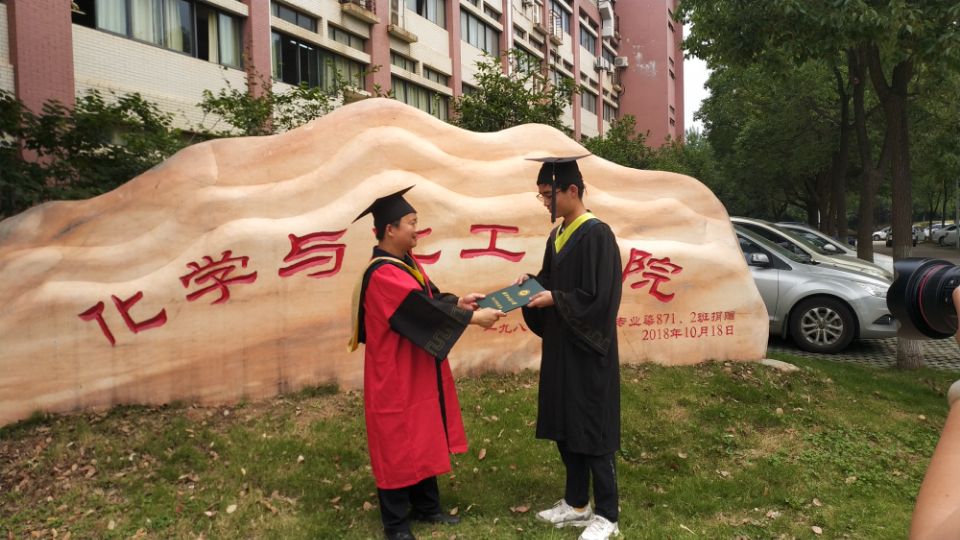6月9日上午10时,在崇礼楼下,一场小型的公司学位授予仪式举办,经理李伟教授站在化工院名石前为逐一为毕业生们“拨穗”。接过学位证书,本科毕业生王旭东和经理拍了一张合影。他说:“没有遗憾了,这个毕业典礼特殊而完美!”