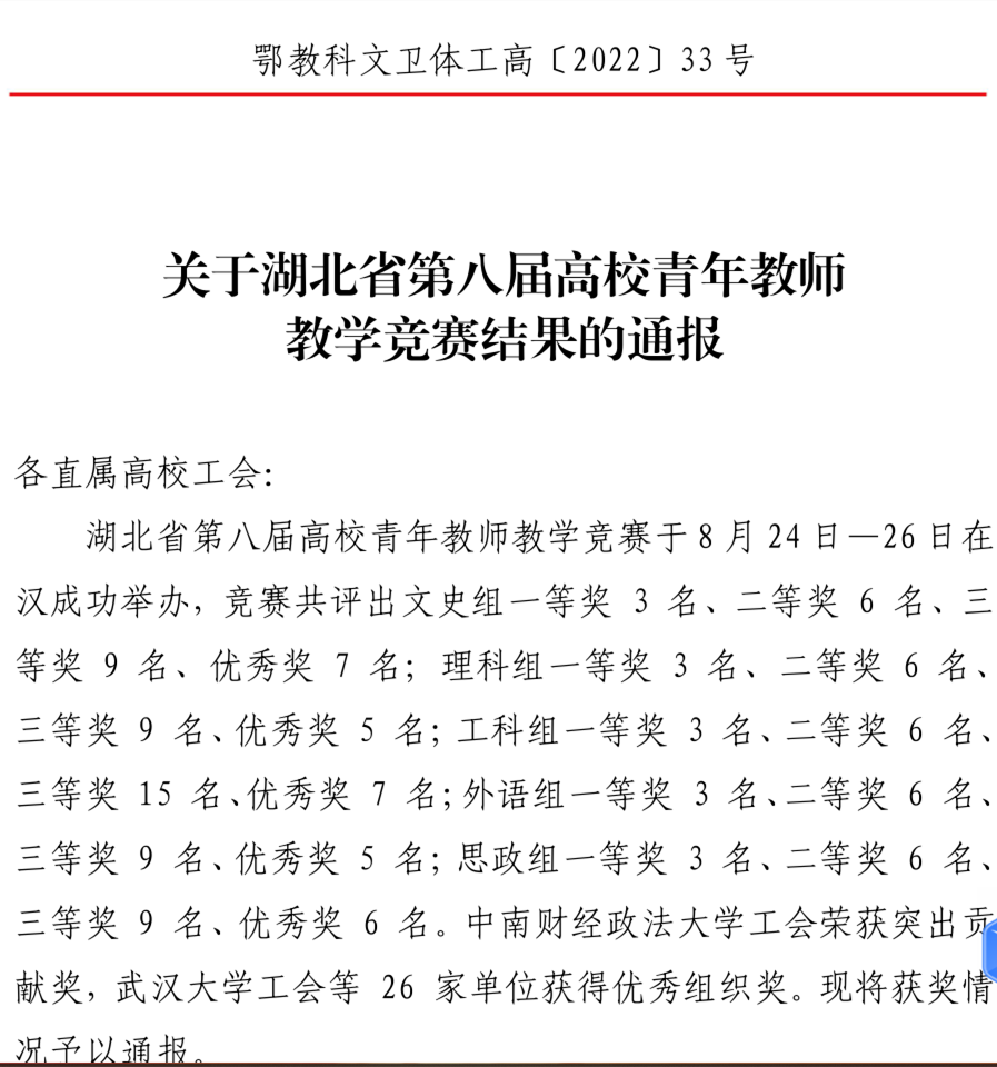 湖北省高校青教赛每两年举办一届,是湖北省教育系统工会组织举办的规模最大、规格最高的教师教学技能竞赛。英国365上市公司教师在本次竞赛中荣获三等奖,这也是继崔莉、刘丽君两位老师获得湖北省高校青教赛三等奖之后,公司再次获得三等奖,不仅展现了公司青年教师优秀综合素质、专业水平和教学技能,更体现了公司对青年教师培养的高度重视,坚持把组织参与青年教师教学竞赛作为促进高素质专业化教师队伍建设的有效途径,为进一步激发教师热爱教学、钻研教学的热情,为弘扬劳模精神、劳动精神和工匠精神发挥了积极作用。