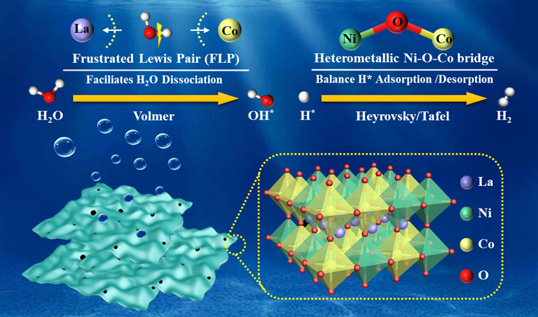 在理论研究方面,首次揭示了钙钛矿表面的Co/Ni位点与相邻La位点可形成受阻路易斯酸碱对对(FLPs),通过空间位阻效应协同活化水分子,显著降低了O-H键断裂的能量,促进了高效的水解离过程。与此同时,异金属桥联位点以氧原子作为电子中继站,实现了电荷的重新分布,有效优化了Co/Ni位点对氢的吸附与脱附平衡。在材料合成方面,通过“膨胀法”成功制备了具有高比表面积的二维LaCoxNi1-xO3纳米片,充分暴露了活性位点并加速了传质过程。实验结果表明,优化后的LaCo1/3Ni2/3O3催化剂在碱性电解液及碱性海水体系中均展现出大电流密度析氢活性。该工作不仅阐明了FLPs位点与异金属桥位点在协同催化中的关键作用,平衡了水解离与氢重组这两个核心步骤,也为开发新一代高效、稳定的钙钛矿基析氢催化剂提供了全新的理论视角与设计策略。