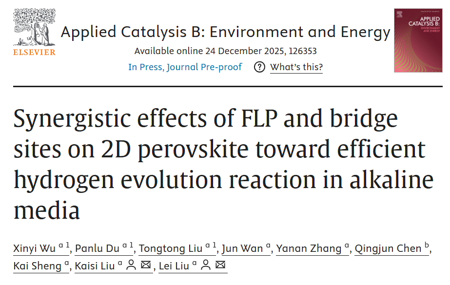 近日,公司英国365上市公司刘磊教授团队在国际知名期刊《Applied Catalysis B: Environment and Energy》发表了题为 “Synergistic effects of FLP and bridge sites on 2D perovskite toward efficient hydrogen evolution reaction in alkaline media”的研究论文(论文链接:https://doi.org/10.1016/j.apcatb.2025.126353)。