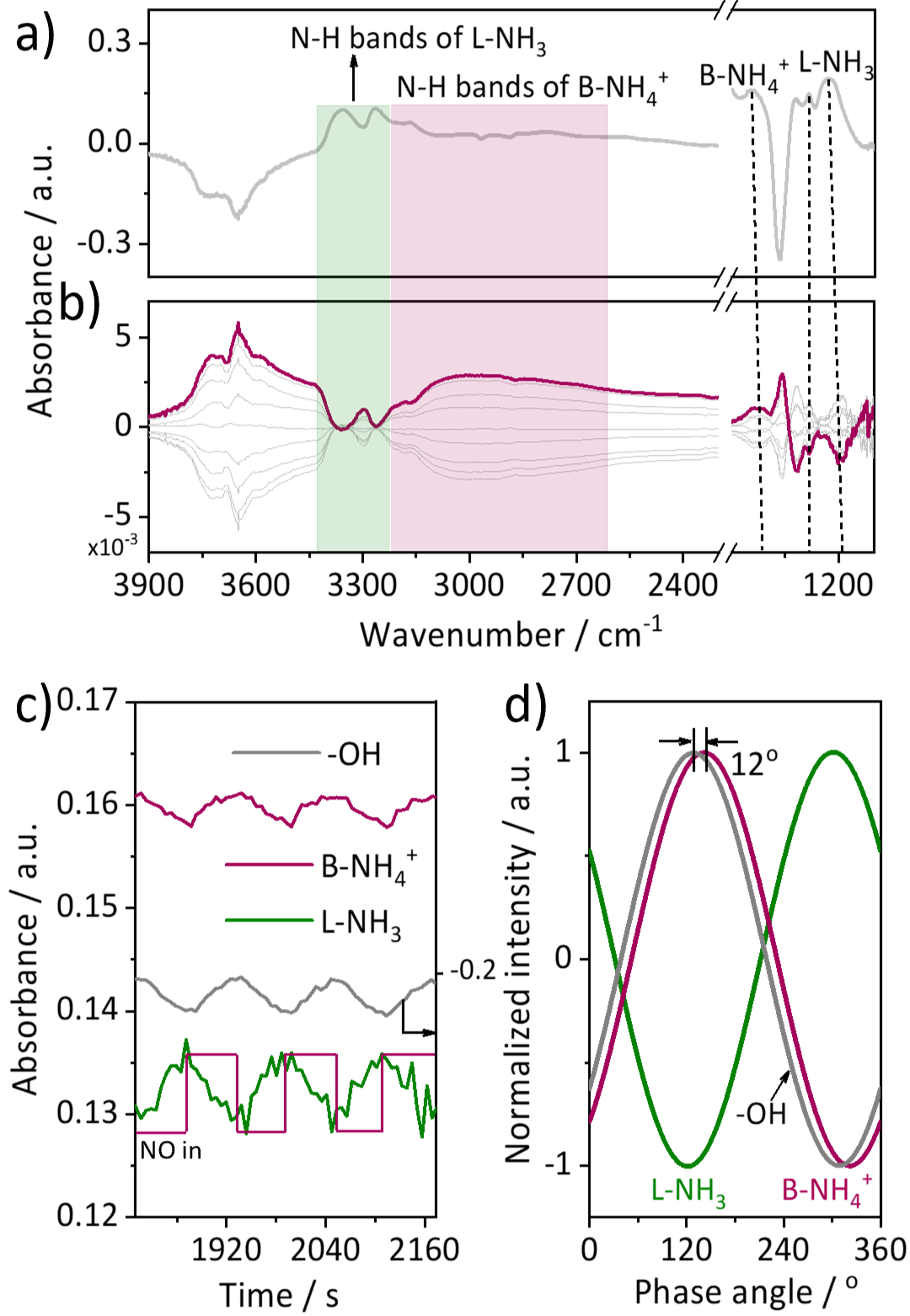 基于多种原位与动态表征手段,研究团队观察到反应过程中表面NH3物种的动态演化。在NO + O2气氛中,吸附在Ce4+ Lewis酸位上的NH3首先被快速消耗并生成N2,而与Ce–O–W结构相关的NH4+物种则表现出明显的滞后消耗特征,显示其并非直接反应物,而是作为“仓库”持续补充反应性Lewis–NH3,从而维持反应的连续进行。这一结果从动态角度揭示了Brønsted酸位在SCR反应中的真实功能。