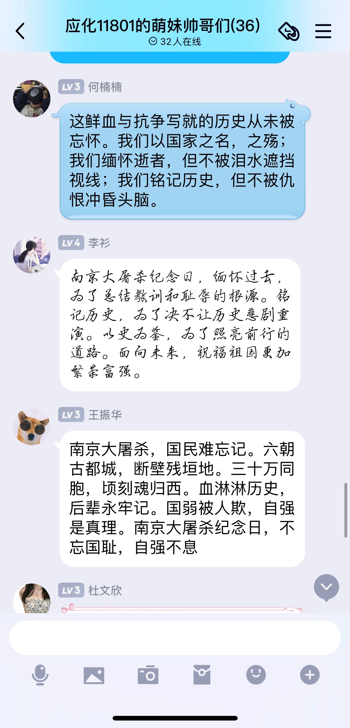 通过主题教育活动,同学们对震惊世界的“南京大屠杀”的历史有了更深入的了解,同学们对日军犯下的暴行痛恨不已,对死难的同胞致以深切地哀悼,纷纷表示:铭记,不只是民族的悲怆,还有落后必亡的训诫;纪念,从不为宣扬复仇的怨念,只为许下复兴的心愿:吾辈当自强。