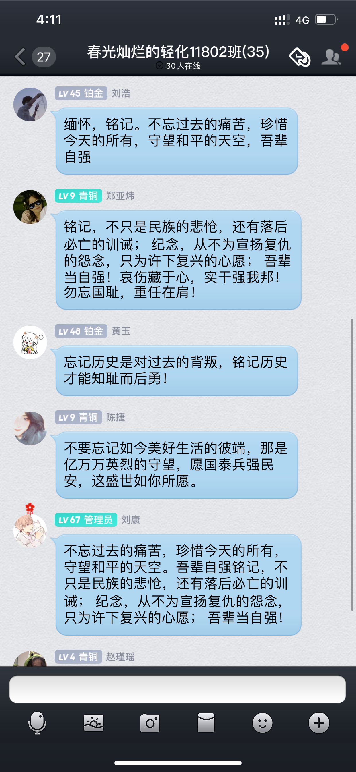 主题班会上,各个班级通过历史影像资料的回放和图片等,了解国家公祭日的历史和由来,教育员工只有努力学习、振兴中华,才能不受外人侵略。