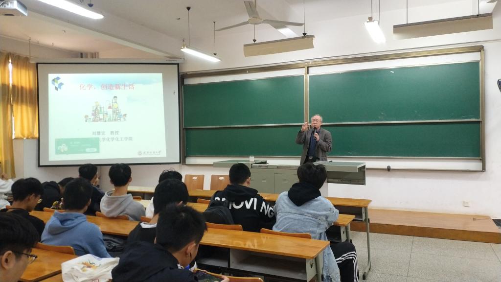 刘慧宏教授从员工的角度出发,首先向同学们介绍了在高中时期,大家所理解的化学是什么,接着他通过列举生活中常见的物品和现象,并讲解这其中包含的化学知识和化学原理。他从化学的地位与作用方面指出,化学是科技与经济建设的基础,是科技发展和国力强弱的标志,大学中几乎各个学科都有化学的参与。他从化学与医药、化学与能源、化学与环境、化学与材料、化学与食品五个方面,介绍化学在生活中的影响和益处,让同学们发现原来化学在我们生活中无处不在,不管是衣食还是住行都与化学息息相关。刘教授重点介绍了医用口罩、消毒液、防护服、酒精等基础化工产品在疫情防控中发挥的不可替代作用,让同学们深刻感受到化学学科的重要应用价值。