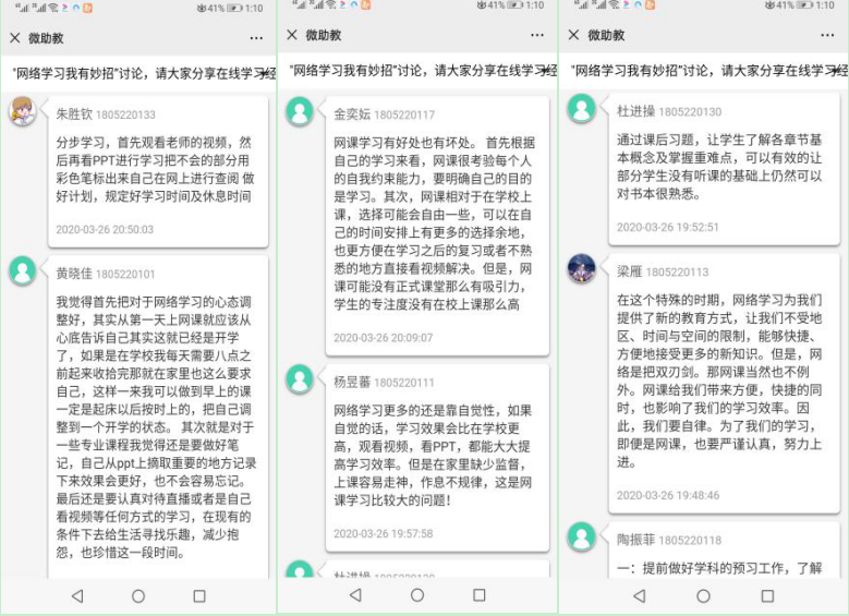 班会第二阶段,班主任老师们邀请大家积极发言,了解同学们的目前的学习效果和存在的困难,征集同学们关于网课的意见和建议。同时还引导大家开展“网络学习我有妙招”讨论,同学们通过讨论墙分享了一些在线学习的小妙招小方法,比如制定良好的作息和学习计划表、利用网络的特点随时随地解决自己疑惑的问题、做好笔记标注重点、重难点的地方可以反复观看等等。