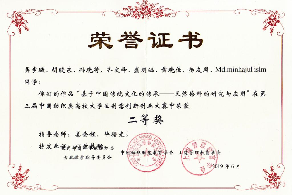 本次大赛自2019年年初开赛以来,历时5个多月,全国45所纺织类高校的208个参赛项目进入海选,参赛高校和参赛项目创历史新高。组委会组织专家进行复赛评审,从实用性和创新能力、产品服务、市场分析、营销策略、方案实现等方面对复赛项目进行了评价,最终共有70个项目入围全国总决赛。公司参赛项目,旨在关注绿色环保与生命质量,目前研发与生产的天然植物染料产品,拥有很大程度上解决传统草木染稳定性差、染色织物的牢度差、染色过程中的重现性差等的缺点,保留传统草木染杀菌解毒、消炎止血、生物可降解性和环境相容性良好等优点,适应当今现代工业化生产要求的创新性,受到评委专家们的一致青睐受到评委专家们的一致青睐,最终脱颖而出荣获二等奖。
