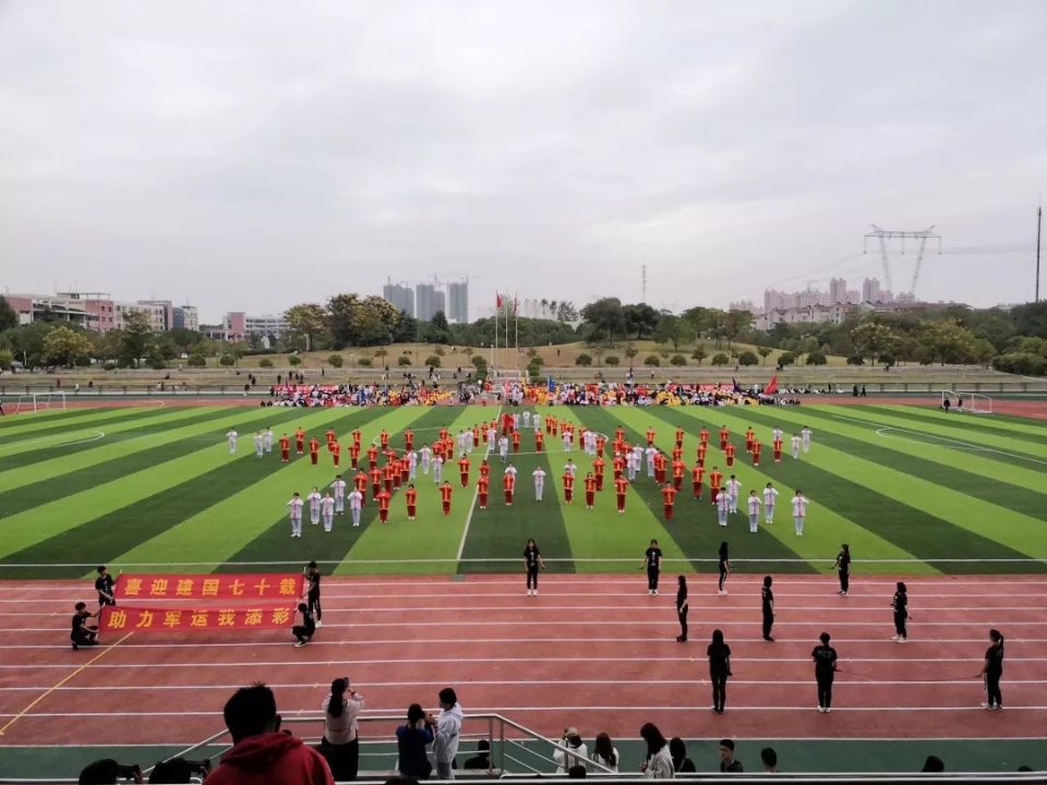 (太极拳队伍摆成五角星方阵,跳绳队伍摆出“70”造型)