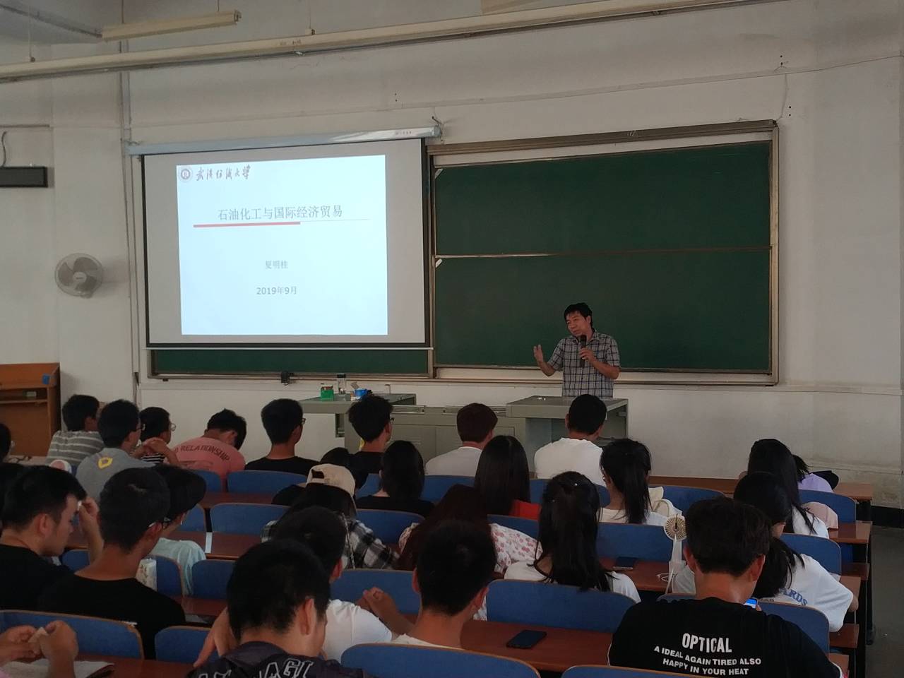 9月30日上午10点,3号教学楼T201教室座无虚席,刚刚荣获“庆祝中华人民共和国成立70周年”纪念章的夏明桂教授正在给员工讲述题为《石油化工与国际经济贸易》的主题讲座。