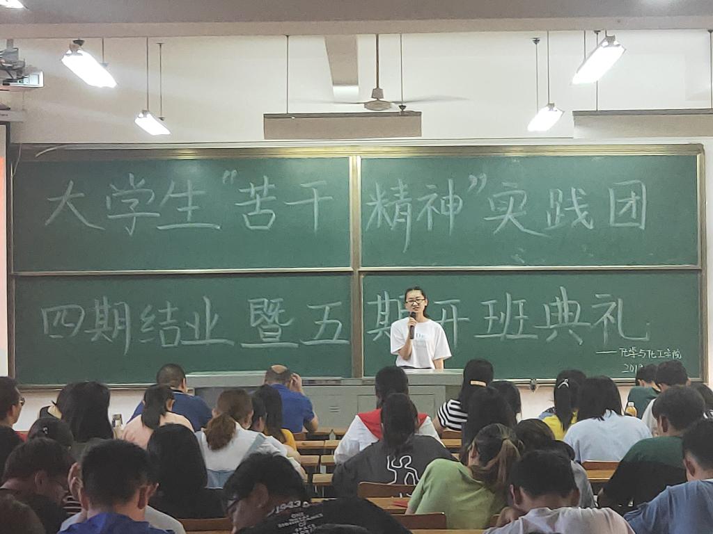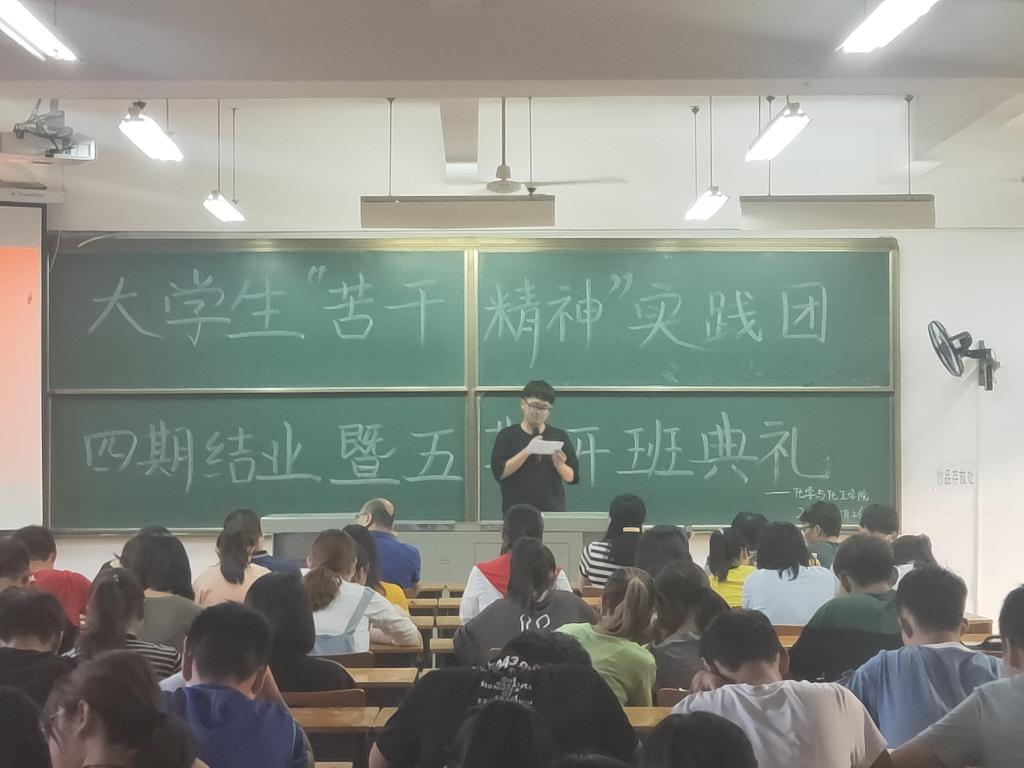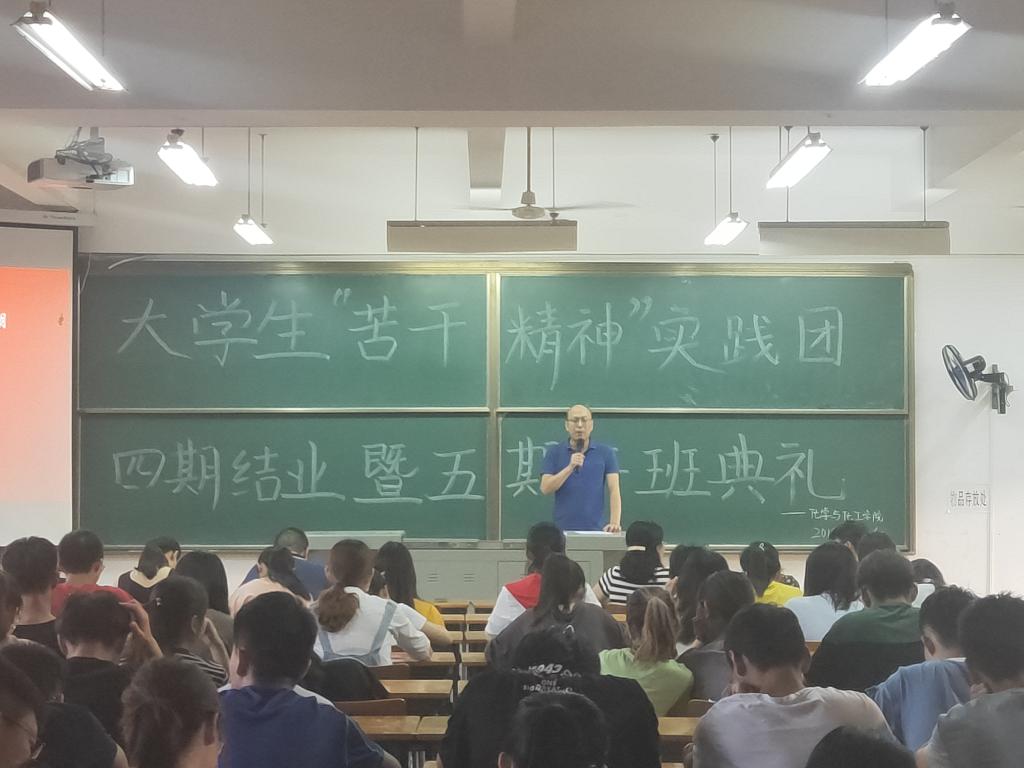 典礼伊始,化工公司党委副书记凡老师同于志财老师一同为苦干团第五期进行授旗仪式。随后的讲话中,凡书记对新老团员强调,一定要牢记总书记嘱托,要能吃苦,要好好干,传承和发扬好“苦干”精神,时刻以高标准严格要求自己,在学习生活中起到先锋模范作用。