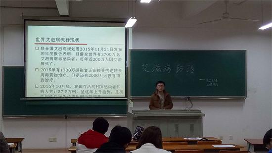 防治艾滋病是一个世界性课题,是一项长期而艰巨的任务。在25日晚的班会上,各班班长首先播放了预防艾滋病的PPT,然后就艾滋病的流行、简介、预防知识进行讲解。其中应化一班班长邱雯静向大家科普了艾滋病传播的4个渠道:性传播、血液传播、母婴传播、体液传播,并特别强调了身为当代老员工,应该做到自尊自爱,树立正确的观念,预防艾滋病传播。同时,不应对艾滋病人戴上有色眼镜,应该在做好预防措施的条件下,平等地对待他们。
