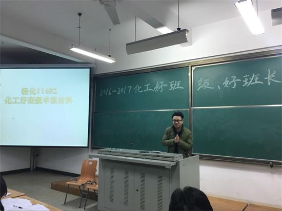 首先上台的是轻化11402班的班长谭永松,他从班级介绍、班风建设、学风建设、宿舍安全文明建设、班会史等5个方面向大家展示他所在班级的精神面貌。紧接着,轻化11401班的班长黄博更是别出心裁,以讲故事的形式来展现自我,展现班级风采。同时,轻化11501班和该班的班长肖可欣也给人印象深刻。她主要表述了班级整体的成绩,班长带领班级的同学开展种种活动,声情并茂的演讲赢得了台下老师的一致肯定。