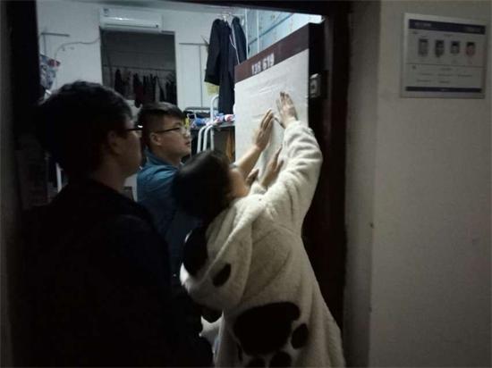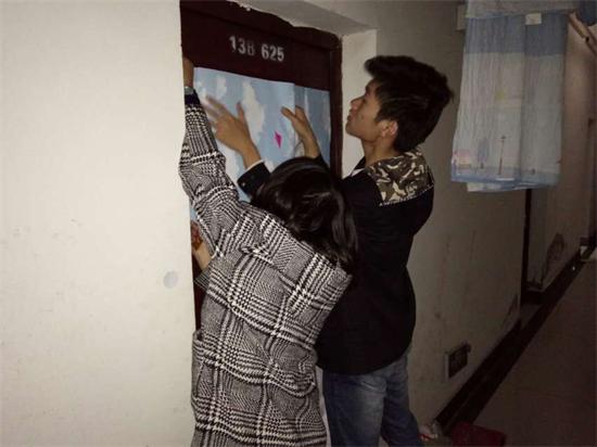 在活动中,成员们两两合作,会先敲门加以询问解释,经过同意后才开始工作,耐心、仔细地将墙纸贴上、裁剪、整平。在寒风扫过纺大狭窄的楼道,秋日的凉意裹挟着志愿者们,可仍然无法减轻他们的热情。