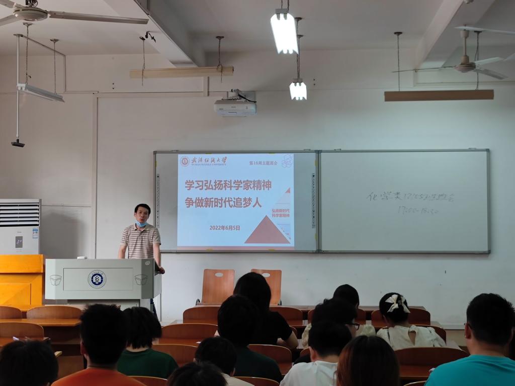 化学类12105班班主任蔡永双讲到:为实现“两个一百年”奋斗目标、实现中华民族伟大复兴的中国梦,应在全社会大力弘扬以“爱国、创新、求实、奉献、协同、育人”为核心的新时代科学家精神,高度重视“人民科学家”等功勋荣誉表彰奖励获得者的精神宣传。
