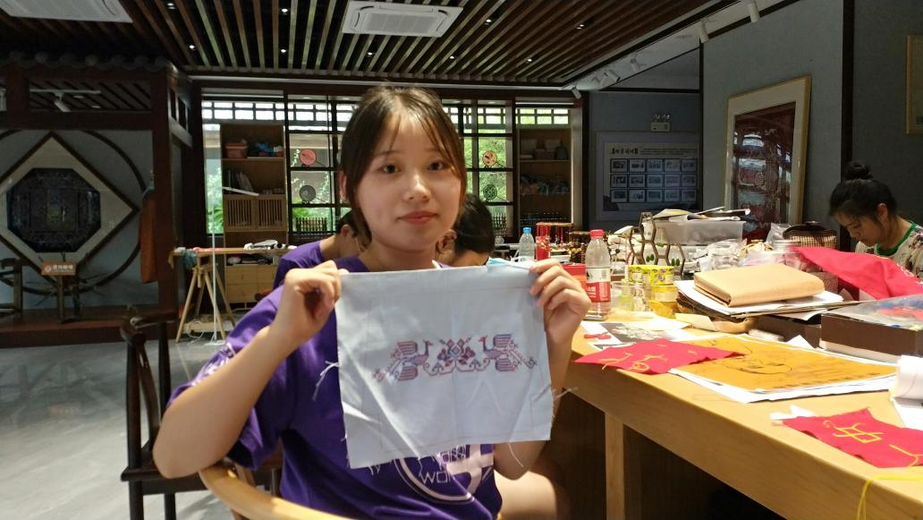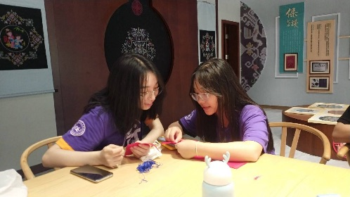洪利说:“黄梅挑花传承不易,我们坚持手工制作,这样才能真正使它得以传承,不要看似不起眼,其实蕴含很多技巧,需要一步一步慢慢掌握”。在洪利的指导下,同学们拿起针线,在用于练习的布上学习黄梅挑花的针法,一整个下午,大家从开始的无从下手到慢慢熟悉,完成了来回线路的挑花,并制作了一些简单字样的图案,繁琐的手工制作打磨着队员浮躁的内心。“自己动手试了才知道挑花的难处,在针线的来回穿插之中,我逐渐感受到黄梅挑花作为非遗的内在价值,虽然是个细活,确有百般韵味”实践团队员昂翁彭措如是说到。