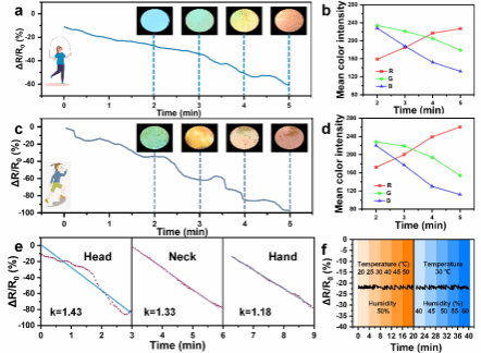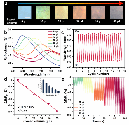 这款具有光学和电学双重信号的汗液传感贴片(图2),能够在运动期间实时可视化监测汗水的积累量(图3)。此项研究为监测人体代谢物提供了创新的交互策略,为可穿戴健康传感设备的设计开辟了新的视角,同时极大地拓展了基于CNC的光子材料在医学相关领域的应用前景。