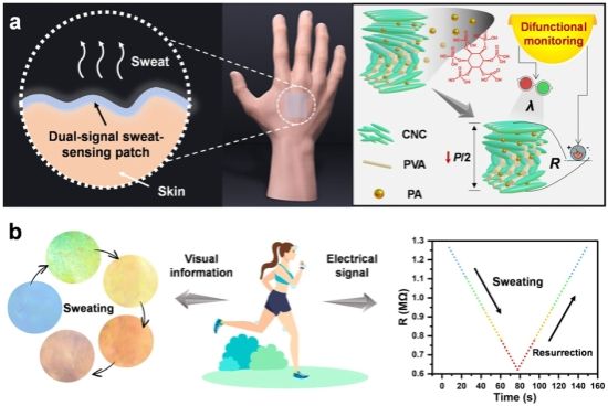 随着可穿戴技术的不断发展,市场对高性能、多功能、可持续性和生物相容性的传感器需求日益增长。纤维素纳米晶体(CNC)光子材料因其独特的可调节结构色、强大的电子传导能力和可再生特性,成为多响应可穿戴设备的优秀候选材料。然而,CNC的自组装过程与传统导电介质的兼容性较差,导致多数CNC衍生化的结构材料难以将响应变色和电传感功能有效整合。