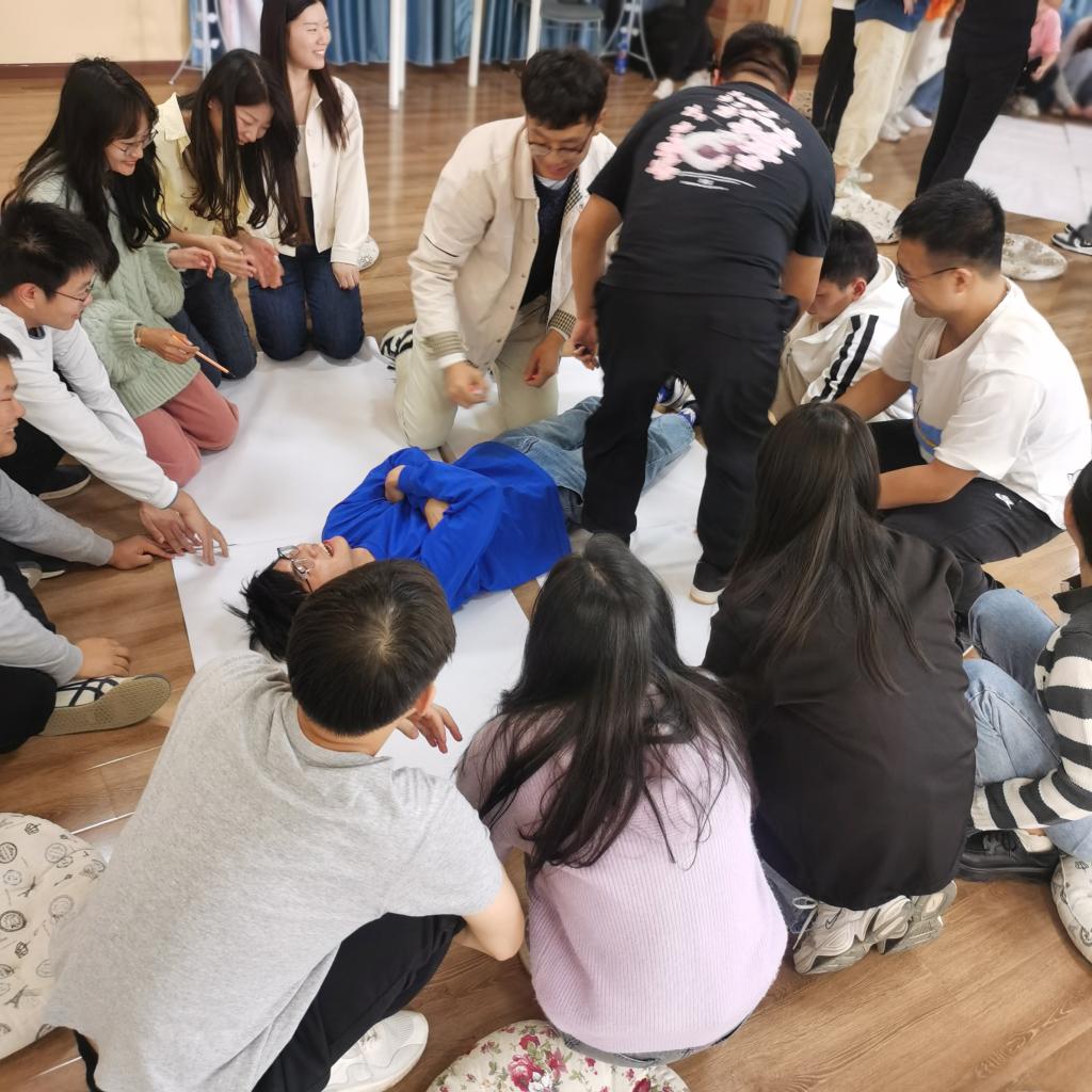 第二个板块为“智慧勇敢”。团队依次进行本体符号测试与心有千千结环节。充分利用伙伴,团体的力量绘制人形图案,释放压力,增强解开心结的勇气。