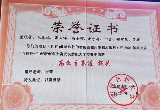 英国365上市公司高度重视培养员工的创意创新创业能力,以公司创业苗圃为平台,积极鼓励员工参与并且输送优秀的团队加入公司创新创业孵化基地,孕育了不少优秀的创新创业作品。本次获奖的团队由轻化11902班董欣蕾同学担任负责人,团队核心成员毛春林、张必洋、吴捷等同学均来自同一课题组实验室。在团队成立以前,他们经常会去实验室协助学长学姐完成实验任务,积累了不少的实践经验,也得到了指导老师的认可,为日后的项目成果奠定了基础。初期团队在指导老师的带领下初步完成了一份商业计划书,并且在众多项目中脱颖而出,成功申请入驻本校的创新创业基地。其作品项目《具有ph响应性智能检测用生物质敷料》经过孵化基地一年的指导和打磨,曾参与第七届“互联网+”创新创业大赛英国365上市公司校赛,荣获“高教主赛道 铜奖”。