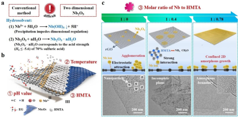 HMTA分子中的氮原子与Nb5+阳离子之间发生强烈的相互作用,促进了HMTA和Nb离子的优先吸附,有助于Nb金属前驱体在GO表面成核和生长。同时,HMTA通过热分解产生氨和甲醛进行还原反应,得到分散性良好的2D a-Nb2O5/rGO复合材料。其中,pH值、温度和Nb5+与HMTA的浓度比为重要影响因素。