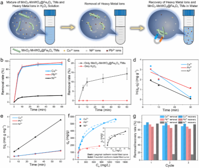 该团队基于静电纺丝,提出了一种低成本、大批量制备MnO2基复合管状微米马达(MnO2-TMs)的普适性方法,并实现了高效的重金属离子去除。源于基质材料的固有柔韧性,此方法可获得多种不同形态的MnO2-TMs。随着形态的变化,基于气泡驱动的MnO2-TMs表现出多模式的运动行为,包括直线型、圆周型、螺旋型甚至随机摆动型。为了阐明形态与运动的内在关系,作者系统地模拟了MnO2-TMs周围的流体动力学。通过引入Fe3O4纳米颗粒,能够实现对MnO2-TMs的磁操控,进行定向导航和高效回收。得益于这些特性,MnO2-TMs在去除废水中的重金属离子方面表现出卓越的性能。值得注意的是,其磁性属性能够促进微马达的快速分离和回收,吸附的离子也可通过调节pH值轻松回收。