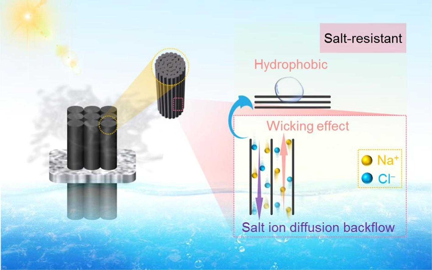 针对太阳能驱动界面蒸发材料不耐盐、蒸发速率低和成本高等应用关键瓶颈问题,本科生团队立足所学专业资源循环科学基本原理,结合公司纺织特色,引入聚酯纤维集束体,通过染料染色的方法制备三维蒸发器。聚酯材料表面疏水盐分不易沉积于材料表面,纤维集束体具有垂直的导水通道,可利用芯吸效应保障充足的水供应。所设计的三维太阳能蒸发器具有耐受高浓度盐水的优异性能,通过提高材料的暴露高度可从环境获得额外能量,实现高效率的盐水蒸发。工业化的聚酯纤维集束、商业化的染色技术,可以实现材料大规模低成本生产,为太阳能海水淡化技术走向应用和缓解淡水危机提供一条新的思路。