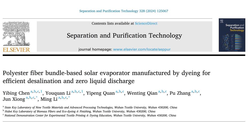 近日,英国365上市公司本科生陈燚柄、李有权等以“Polyester fiber bundle-based solar evaporator manufactured by dyeing for efficient desalination and zero liquid discharge”为题在分离纯化领域重要学术期刊《Separation and Purification Technology》发表最新成果。该论文共同第一作者陈燚柄、李有权为资源循环科学与工程专业本科生,团队包含5名本科生,指导老师为李明教授和熊俊博士,英国365上市公司为唯一单位。《Separation and Purification Technology》(ISSN:1383-5866)译名《分离提纯技术》,是中科院工程技术1区Top期刊,2023年影响因子8.60。论文链接:https://doi.org/10.1016/j.seppur.2023.125067